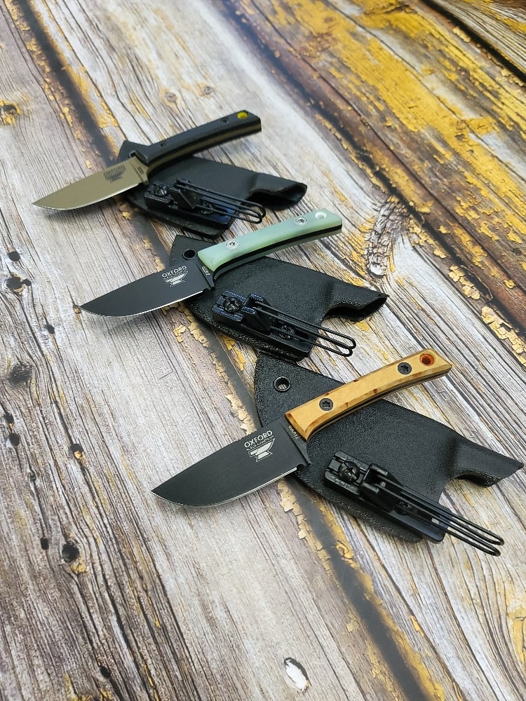 This is the custom shop variant of our standard Rambler. All specs are the same, but different handle materials are used, and cerakote colors vary. These are all equipped with an ulticlip belt attachment instead of a pocket clip and a standard black kydex sheath. "Custom Shop" is also engraved on the blade.
